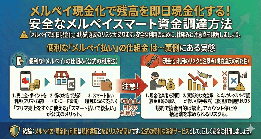 メルペイは本来、商品やサービスの決済を目的としたサービスであるため、現金化を前提とした利用は規約との関係が問題になる可能性があります。