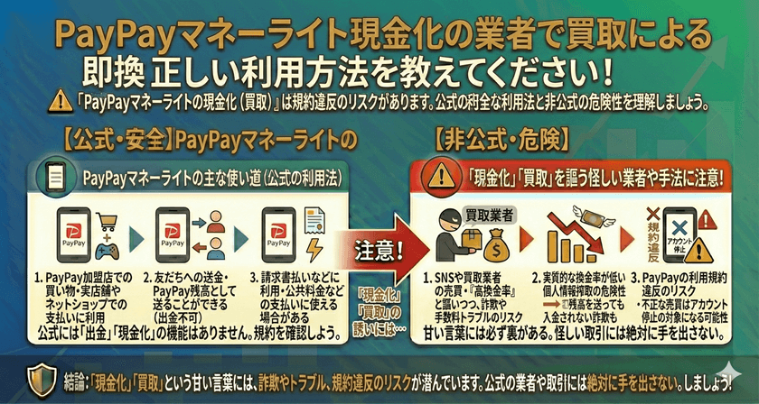 PayPayマネーライトは、日々の支払いに便利な優れたキャッシュレスツールですが、その特性上、銀行口座への直接出金はできません。「現金化」や「買取」といったキーワードで非公式なサービスを探すことは、規約違反によるアカウント停止、高額な手数料、そして詐欺被害という多大なリスクを伴います。